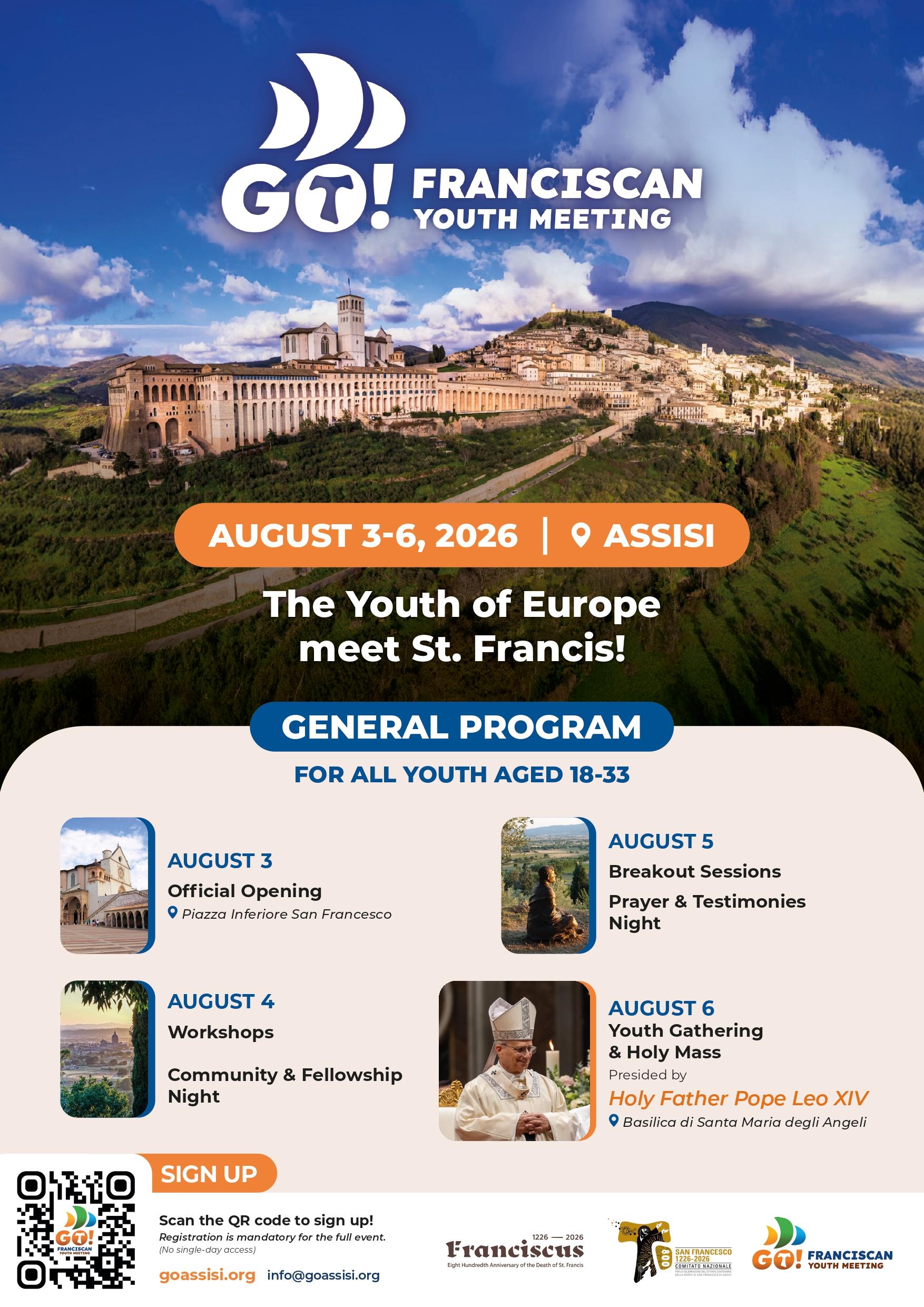 Vyvrcholením celého stretnutia bude 6. augusta návšteva Svätého Otca Leva XIV., ktorý príde do Assisi špeciálne preto, aby sa stretol s európskou mládežou. Pápež bude predsedať záverečnej svätej omši, počas ktorej prítomným udelí „misionársky mandát“, aby priniesli svetlo evanjelia späť do svojich domovských krajín. Záujemcovia o bližšie informácie a registráciu môžu kontaktovať organizátorov na adrese info@goassisi.org.